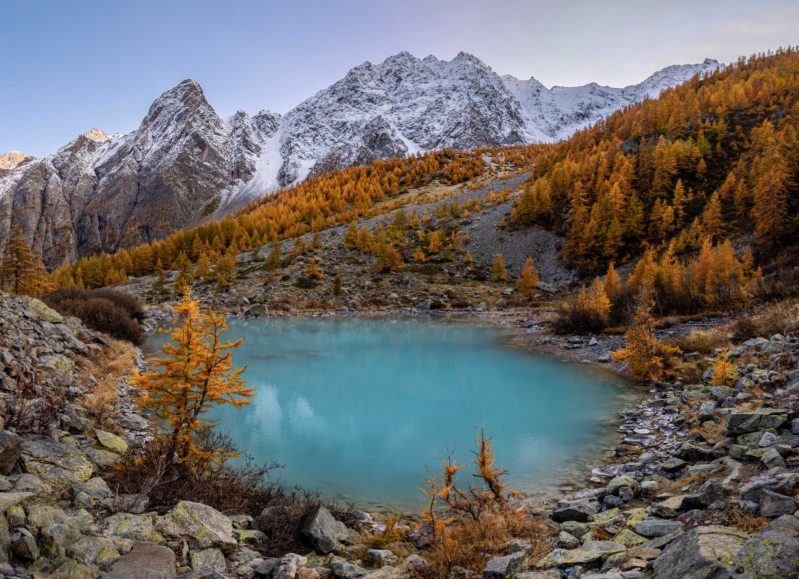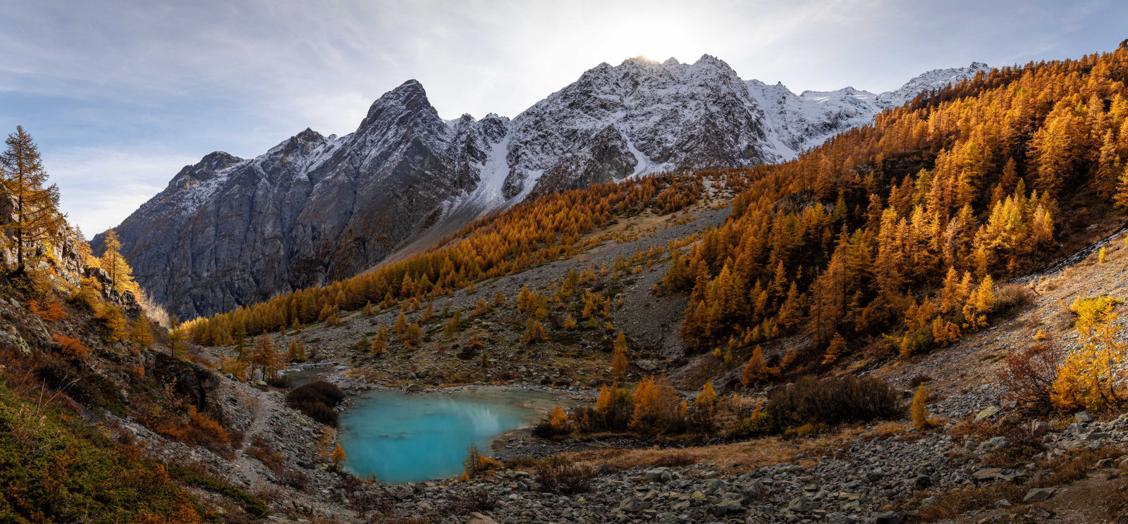 Après environ 1h de marche, nous atteignons le lac de la Douche avec sa magnifique couleur menthe à l'eau. La complémentarité des couleurs est juste parfaite : le lac entouré de mélèzes dorés et surplombé par les Pics du Casset et les Têtes Sainte Marguerite fraichement recouverts par les premières neiges. Bleu, blanc, or.