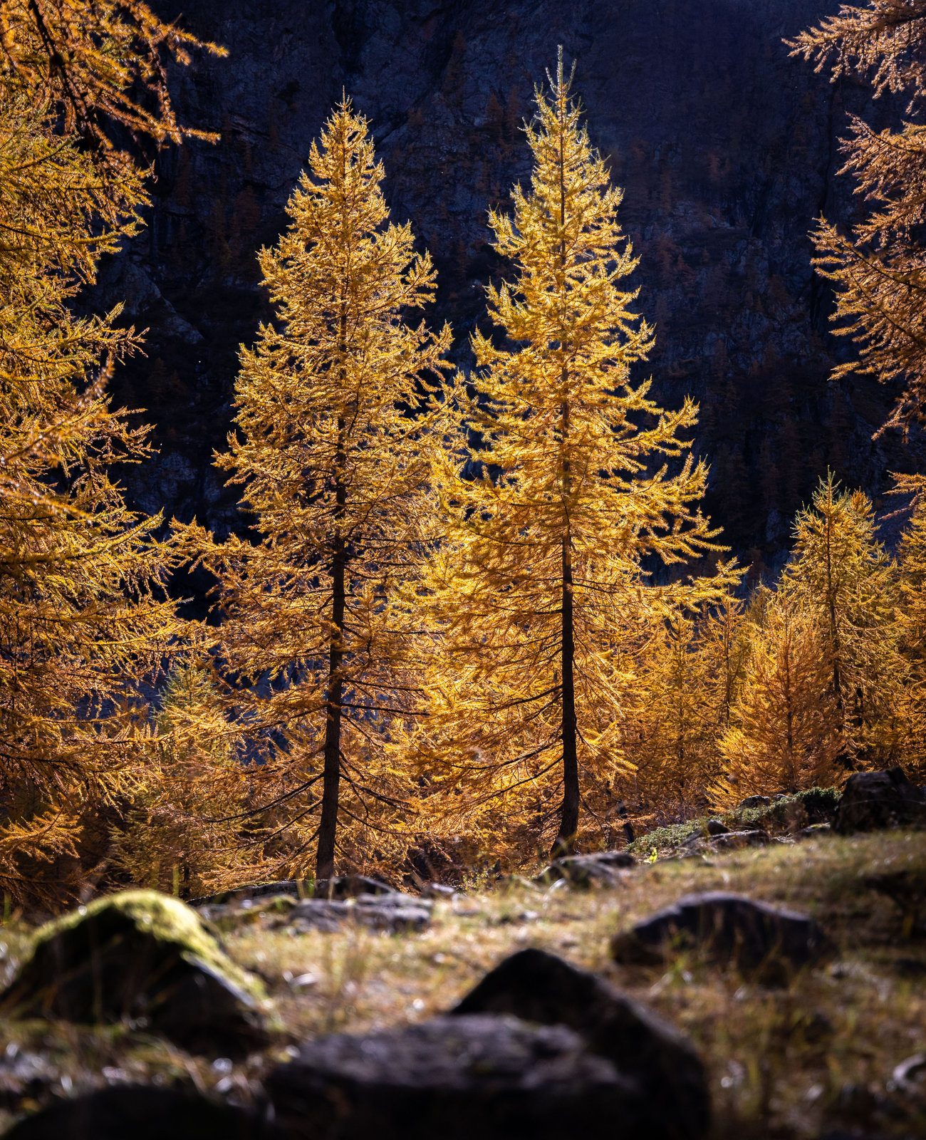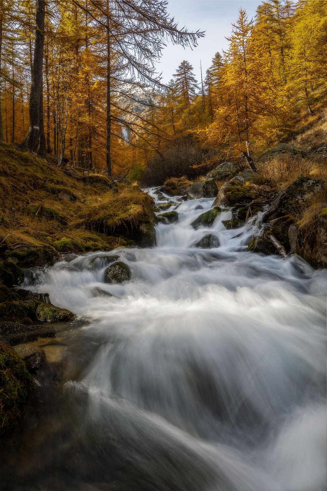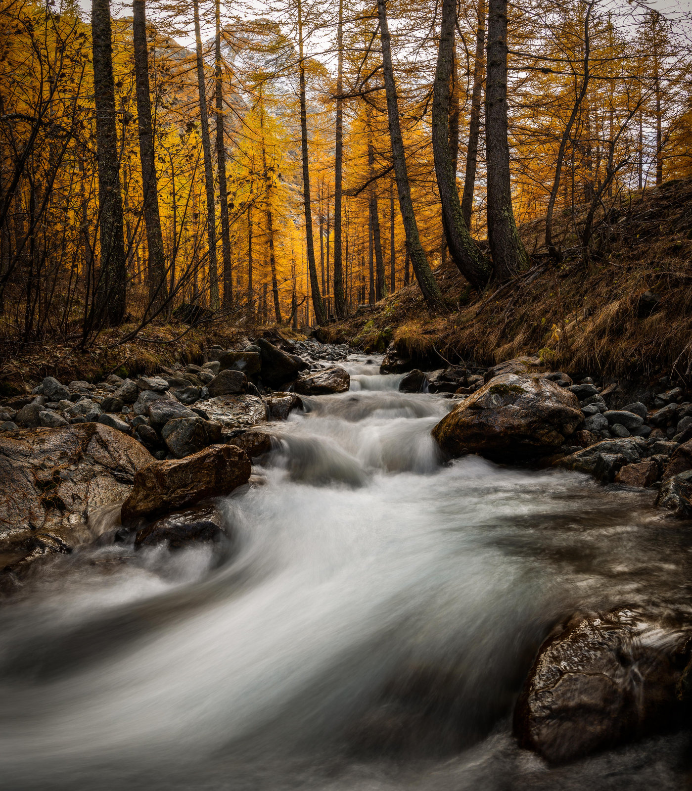 Un dernier arrêt au lac de la Douche (première photo en panorama) et nous pénétrons à nouveau dans le bois du Casset. Dans le bois la lumière est filtrée par les mélèzes et donne une ambiance magnifique. Je ne peux résister à la tentation de faire quelques poses longues le long de la rivière.