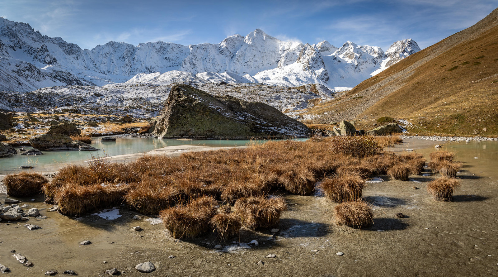 Avant de redescendre, nous décidons d'aller faire un rapide aller retour aux lacs du Glacier d'Arsine. Très vite, nous rencontrons la neige fraiche et de l'automne nous passons à l'hiver. Nous sommes à l'ombre et malgré le soleil qui monte dans le ciel, les températures peinent à devenir positives. Le col d'Arsine puis les lacs éponymes sont rapidement atteints. Ils sont gelés dans leur quasi totalité. Seul une petite trouée dans le lac permet au Pic de Neige Cordier de se refléter brièvement.