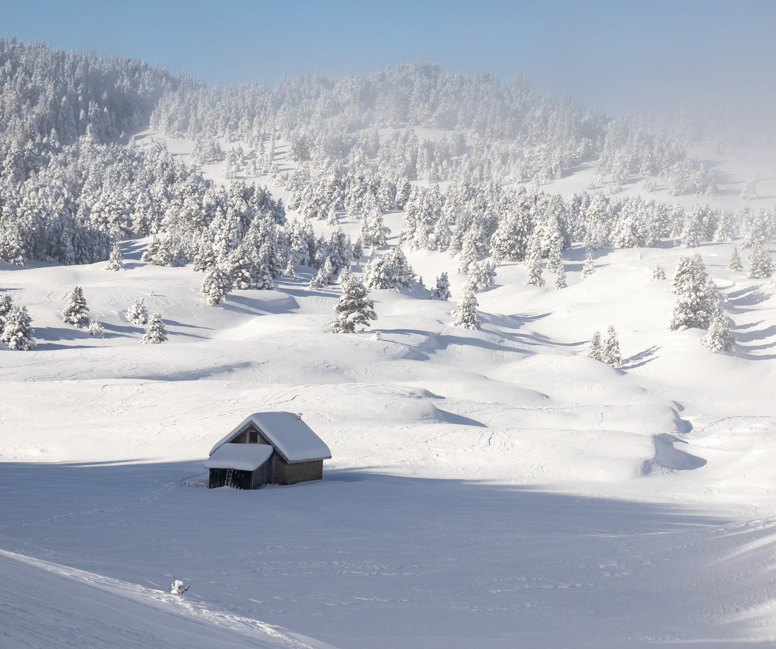 Nous avions initialement prévu de bivouaquer près de la Cabane des Aiguillettes vers le Pas des Chattons. Malheureusement, la neige fraichement tombée, l'absence de trace et une météo plutôt exécrable ont rendu la progression difficile et le soleil se couche déjà lorsque nous arrivons au niveau de la Cabane de Pré Peyret. Partis pour bivouaquer sous tente, nous choisissons finalement le confort de la Cabane pour passer la nuit. En effet, le vent est fort et il neige toujours, l'option tente n'est pas très tentante !