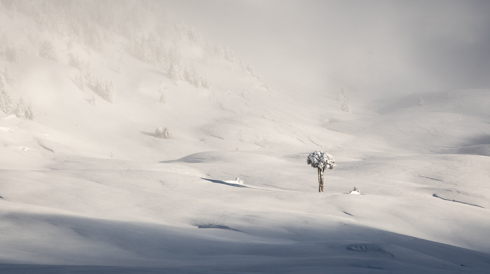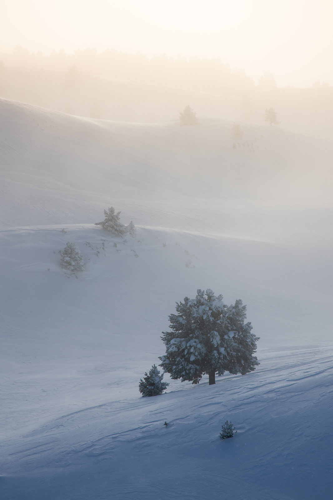 Le lendemain matin, réveil à 5h pour tenter de rejoindre la Plaine de la Queyrie avant le lever du soleil. Il est tombé 20cm de neige fraiche pendant la nuit et la progression dans la poudreuse est pour le moins assez pénible. Nous nous relayons -de façon assez inégale il faut le dire- pour faire la trace. Nous arrivons finalement à l'aube, la plaine immaculée rien que pour nous. Le lever de soleil n'est pas riche en couleurs mais la lumière filtrée par la brume, forme une ambiance particulièrement douce et propice à des compositions minimalistes.
