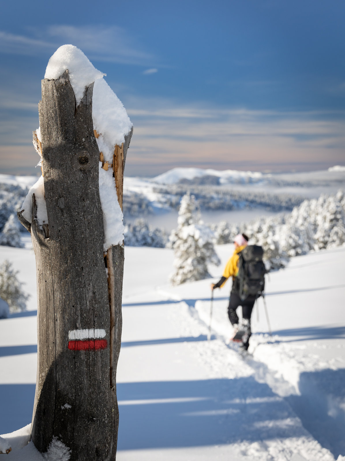 Une pause repas bien méritée et nous rechaussons nos raquettes pour faire le chemin retour jusqu'au parking de Beure. Nous en profitons également pour redécouvrir le paysage emprunté à l'aller. L'absence de visibilité ne nous avait pas vraiment permis d'en profiter ! La trace faite et refaite par les nombreux passages de skieur et raquettistes depuis le matin est très bonne et nous permet de rentrer rapidement.