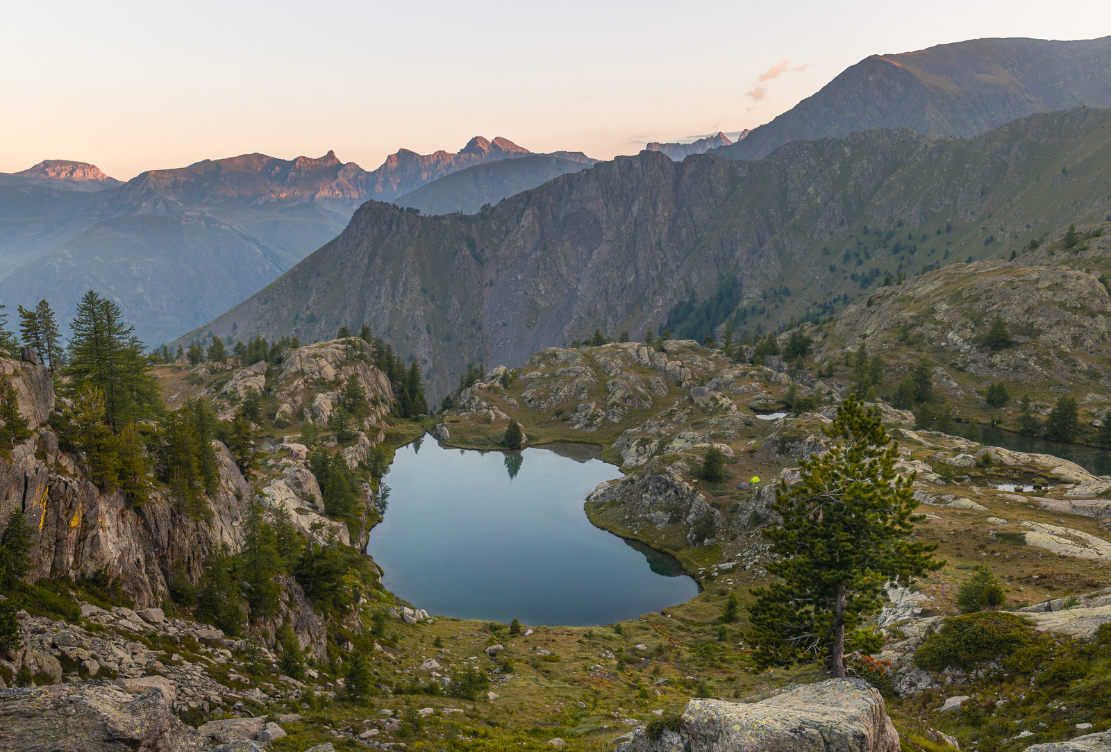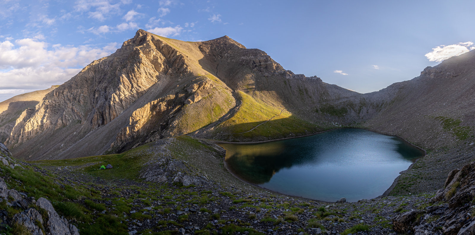 S’en suit une deuxième partie de journée dans un terrain très "montagne" (comprenez carrément casse gueule). La palme d’or revenant à la descente de la Brèche Borgonio ! Du bon sentier d’éboulis raides comme on les aime et encore plus avec un sac de 20kg. Heureusement, les lacs de Ténibre ne sont plus loin et nous finissons par poser notre tente sur un joli (mais pas plat hélas) promontoire qui surplombe les berges d’un des lacs.