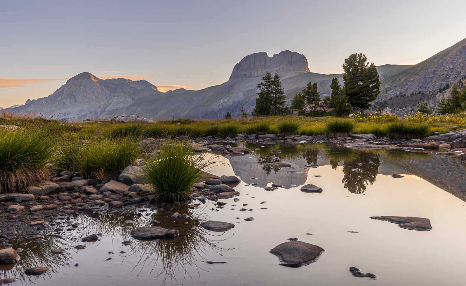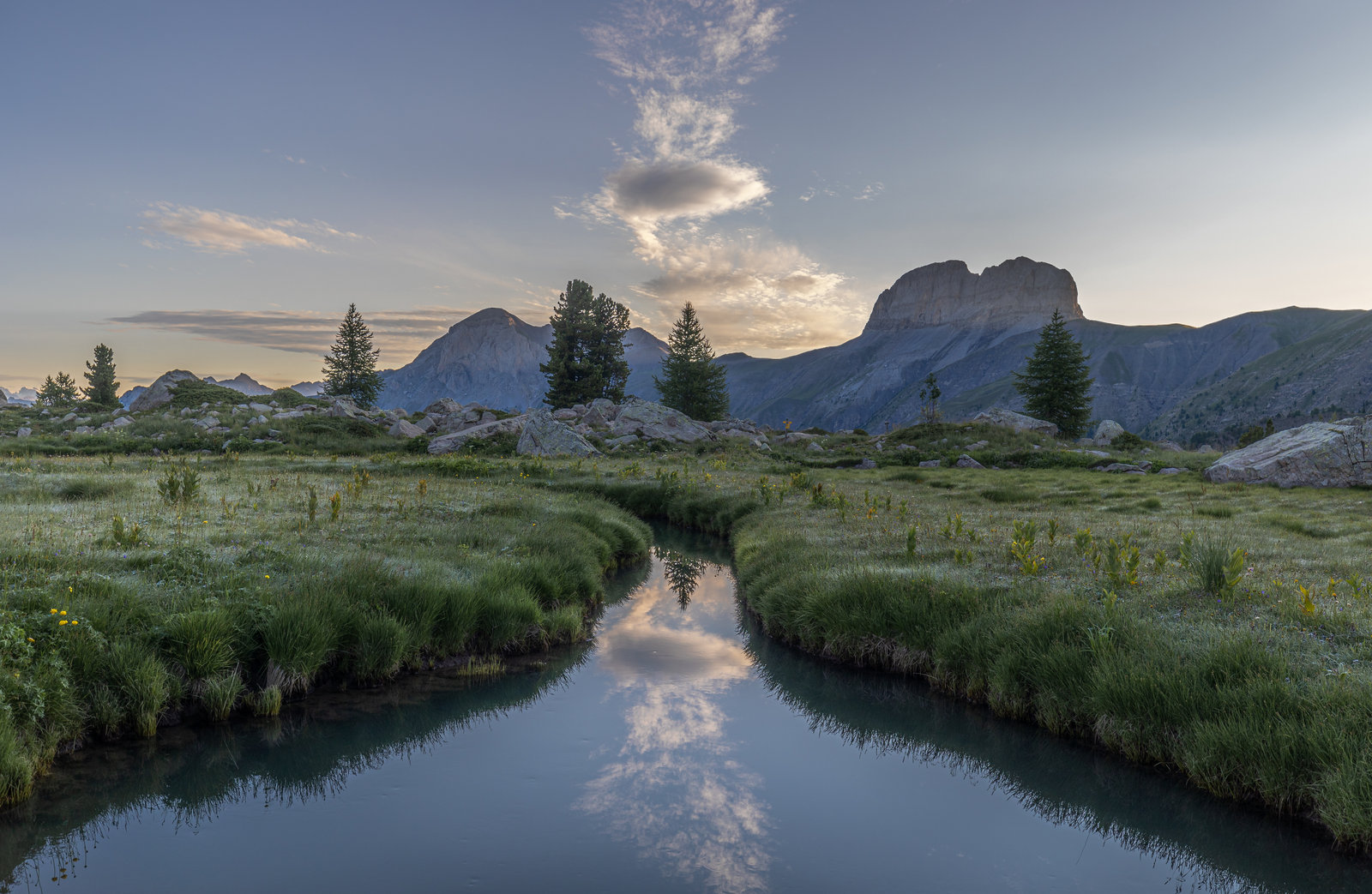 C’est donc dans le vallon de Laverq que nous terminons notre périple. L’objectif classique de la randonnée dans vallon consiste à rejoindre les Eaux Tortes, un plateau humide constitué de petits ruisseaux tortueux qui forment de jolis méandres. Un tableau très bucolique que je voulais admirer par moi-même depuis un petit moment. L’endroit est effectivement très beau et nous posons nos tentes près d’un grand rocher à la forme très singulière face aux Grande et Petite Séolane.