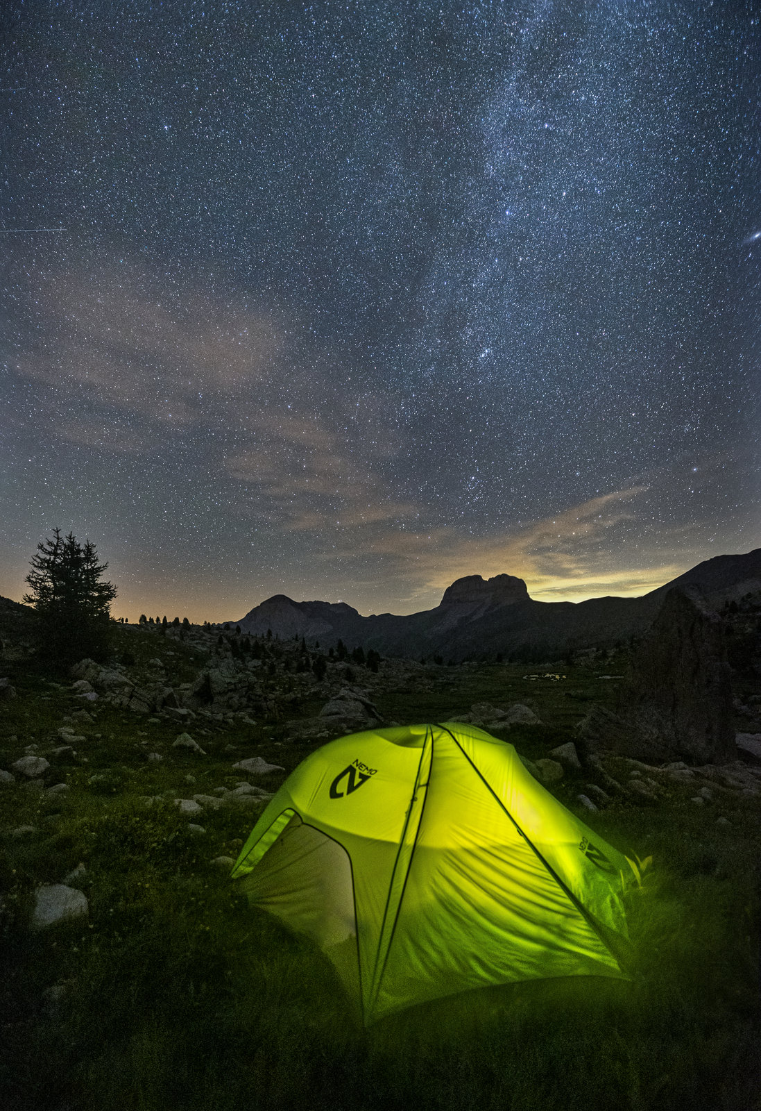 Coucher de soleil, voie lactée, lever de soleil, tout se passait bien et puis… LA GRÊLE ! J’ai battu ce matin-là mon record de rempilage de campement. A ce moment, nous ne regrettons pas notre choix de ne finalement pas bivouaquer sur le Mont Ténibre ! Par chance, ce genre d’épisode n’est jamais long et le ciel, bien que menaçant tout le reste de la journée, nous a ensuite laissé tranquilles jusqu’à la fin de cette première fausse boucle. Après un demi-tour par le chemin de l’Energie et une rencontre furtive avec hermine, mouflons et chamois, nous revenons aux lacs de Vens, mais par l’autre côté cette fois-ci et posons notre campement au bord du plus petit des lacs pour une belle soirée en compagnie de nos moustiques bien aimés.